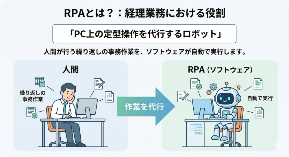 RPAとは、人間がパソコンで行う定型的な操作を、ソフトウェアのロボットが代わりに実行する仕組みです。